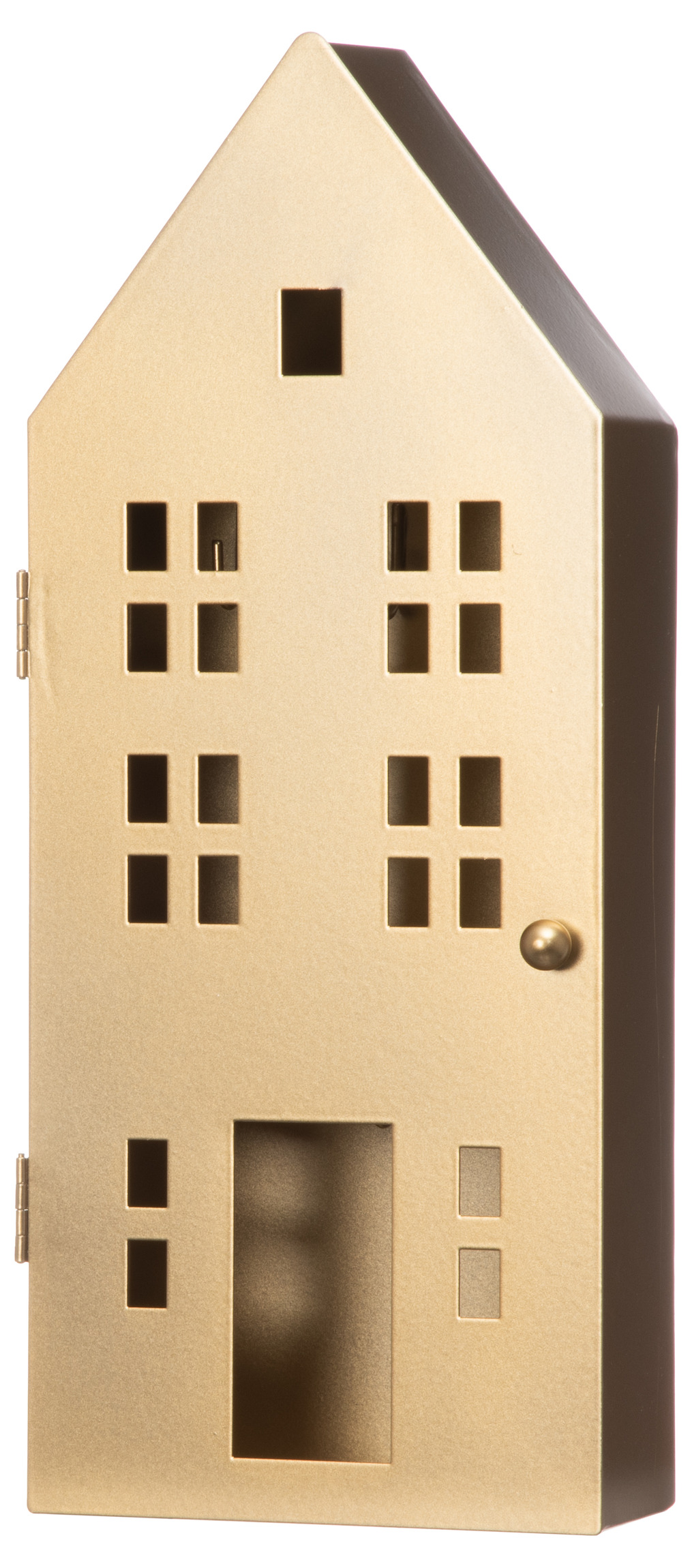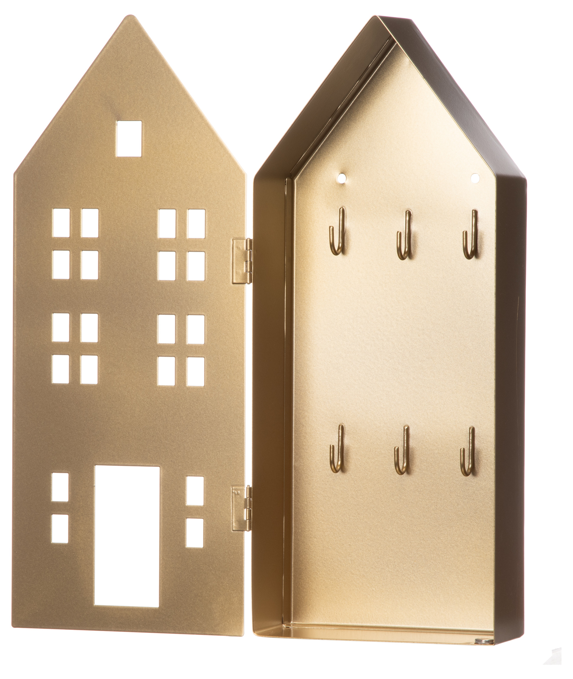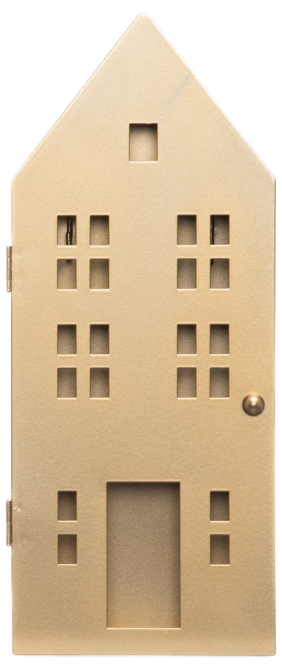 Håll ordning på dina nycklar med detta charmiga nyckelskåp i form av ett hus. Den stilrena designen i guld gör att skåpet passar in i de flesta hem – perfekt i hallen, köket eller på kontoret.